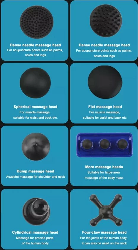 De 12 verschillende mondstukken en de 6 instelbare snelheidsniveaus geeft je stijve of overspannen spieren een diepe massage die de stijfheid van je spieren verminderd en het bindweefsel verzacht.