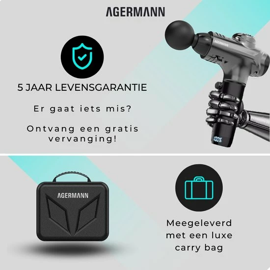 Bovendien zorgt onze garantie van 5 jaar (de langste garantieperiode die er is op een massage-apparaat) ervoor dat je nooit problemen ondervindt bij het gebruik van ons apparaat. En zelfs als dat wel het geval is, vervangen we het oude apparaat gratis door een nieuwer exemplaar. Het is een van de vele redenen waarom topsporters voor AGERMANN kiezen.