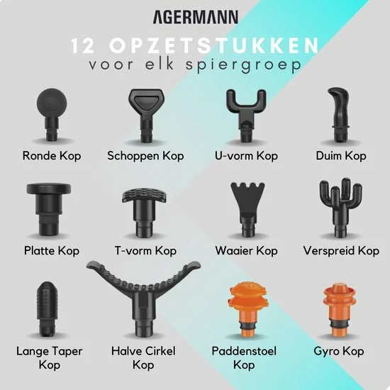 Elke spiergroep is anders en elk doeleinde vereist een andere aanpak. Daarom krijg je bij de AGERMANN massagegun 12 opzetstukken voor alle spiergroepen.