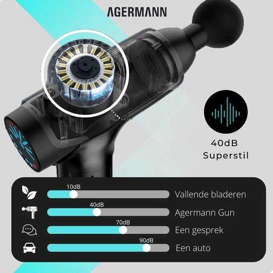Écht ontspannen kan natuurlijk niet als je massageapparaat veel geluid maakt. Daarom heeft de AGERMANN Massage gun een geluidsniveau van slechts 35-45 dB. Dit is ongeveer 30 dB minder dan de gemmidelde massagegun. Zo kan je helemaal tot rust komen.