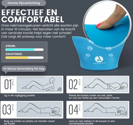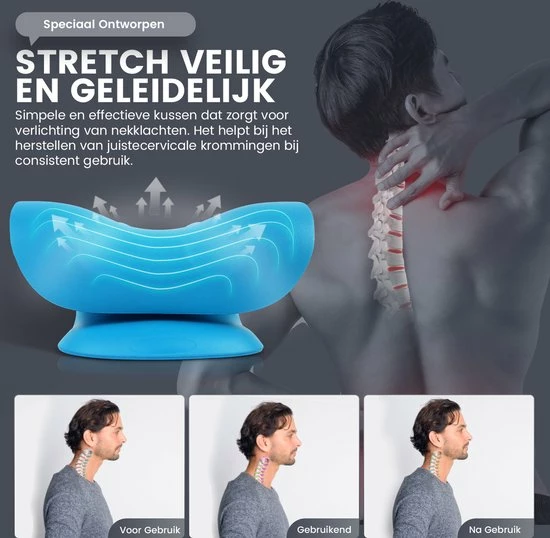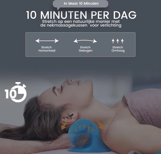 U plaatst de kussen onder uw nek en gaat liggen voor 8 tot 10 minuten. Door de cervicale tractie wordt uw nek gedurende het gebruik uitgerekt. Hierdoor ontspannen de gespannen spieren, waardoor de bloedsomloop uiteindelijk wordt verbeterd.