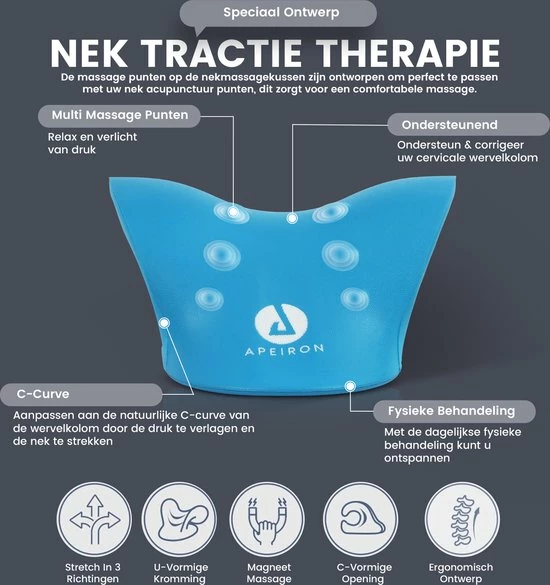 Heeft u wel eens last van nekklachten die uw leven een stuk lastiger maken? Dit is een veel voorkomend probleem als resultaat van een slechte houding. De slechte houding zorgt voor veel spierspanning in de nek, wat hoofd- en nekpijn, vermoeidheid en nog veel meer klachten kan veroorzaken. Daarom is het voor u verstandig om deze Apeiron Massagekussen te proberen, deze massagekussen maakt namelijk gebruik van cervicale tractie, wat enorm veel klachten verhelpt of voorkomt. Met deze nekstretcher zorgt u voor een ultieme ontspannende ervaring waarbij uw spieren en wervels tot rust komen.