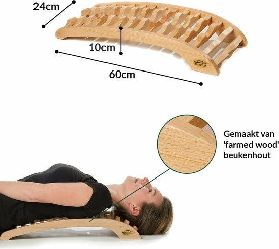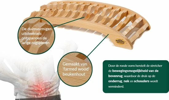 Als gevolg van te veel zitten en te weinig beweging is bij veel mensen de beweeglijkheid van de bovenrug sterk verminderd. Dit probleem wordt gecompenseerd door een verkeerde houding, waardoor de welbekende lage rugklachten en nekklachten optreden. Door de ronde vorm van de stretcher herstelt deze de bewegingsmogelijkheid van de bovenrug. Met de knobbels van de Backstretcher masseer je je lange rugspieren langs de wervelkolom, waardoor je wervelkolom soepeler wordt. Je merkt vanzelf dat wanneer je de rugstretcher enige tijd gebruikt, je houding veel beter wordt. Combineer je het gebruik van de Backstretcher met buikspieroefeningen, dan verzeker je jezelf van een blijvend resultaat.