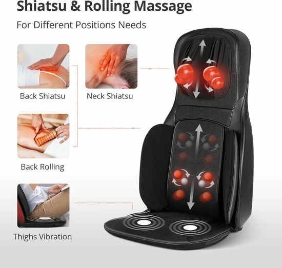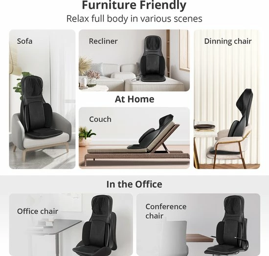 Met zes massagefuncties van nek tot kont, kun je altijd en overal ontspannen, of het nu op de bank, keukenstoel, kantoor, enz. is. Je ouders, geliefden en vrienden kunnen genieten van een rustgevende massage, een geschenk kan in de lijst worden opgenomen van de beste kerstcadeaus.