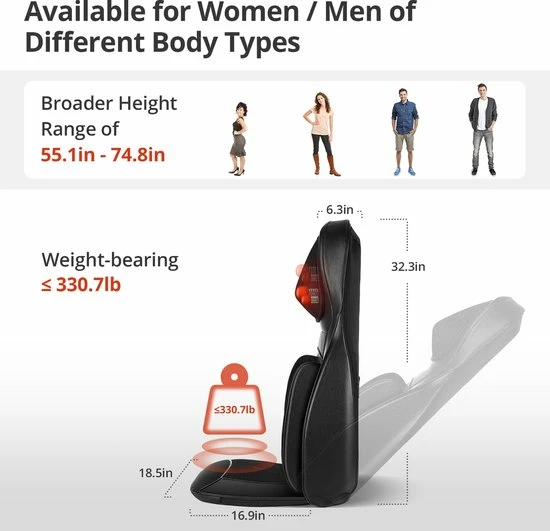 De technische upgrade vergroot het werkbereik, massageknoop van de nek naar beneden 4 cm, 1,4-1,9 m mensen zijn geschikt voor dit massagekussen. Plus bufferschot van de rug vermindert een bepaalde intensiteit, passend bij een gevoelige menigte. We werken er hard aan om steeds meer van jullie van dienst te zijn.