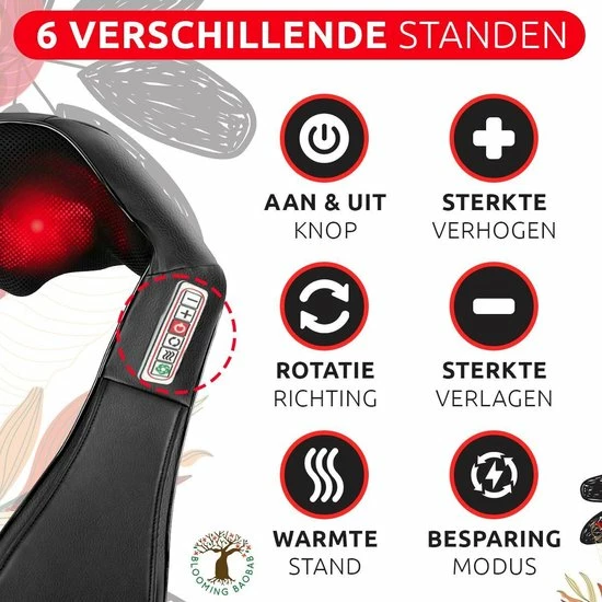 Blooming Baobab massage kussen beschikt over 6 verschillende intensiteit standen en verstelbare warmte voor de perfecte druk en shiatsu massage-beleving. De meeste massage kussens zijn voorzien van 3 of 4 intensiteit standen waardoor je net niet de juiste druk krijgt. Geniet van een zeer ontspannend massage of juist van een hele intense massage naar wens.