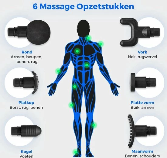 Elke spiergroep is anders en elk doeleinde vereist een andere aanpak. Daarom krijg je bij de Bushifi massagegun 6 opzetstukken voor verschillende spiergroepen: