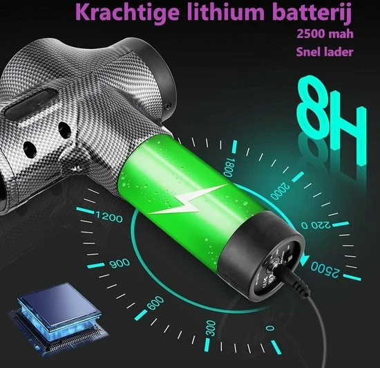 De Bushifi pro massage gun bevat een 2500 mAh hoge kwaliteit oplaadbare lithiumbatterij dat tot wel 8 uur meegaat wanneer deze volledig is opgeladen (afhankelijk van het type massage dat u kiest).