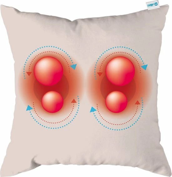 Er zijn een tweetal massages te selecteren, linksom of rechtsom. Tevens beschikt het kussen over een ingebouwd infrarood verwarmingsysteem. Dit verwarmingsysteem is ge?ntegreerd in de vier zogenaamde massage duimen, waardoor het kussen heerlijk warm aanvoelt tijdens de massage. Men kan met een korte druk op het knopje de verwarming naar keuze aan of uit zetten, zonder dat het kussen uit gaat.