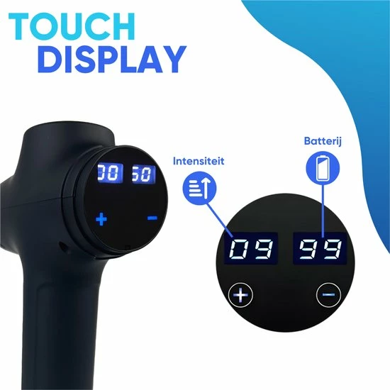 Aan de onderkant van de Massage gun bevindt zich de aan/uit knop. Wanneer het apparaat aan staat kan je met de display op de achterkant precies zijn hoeveel batterijen het apparaat bevat en welke stand er aan staat. Met het plusje kan je de gun harder zetten met de min zachter. Met een volle accu kan je 2/5 uur werken, afhankelijk van de stand waarmee je werkt. Voor een volledige accu moet de Massage gun 1/2 uur worden opgeladen.
