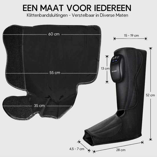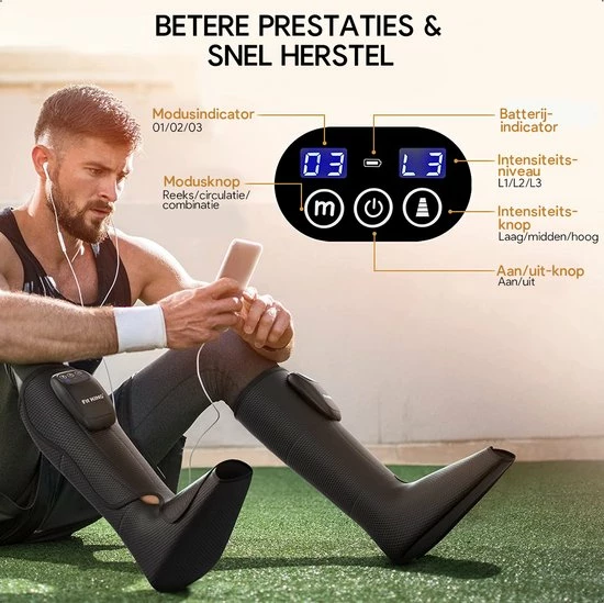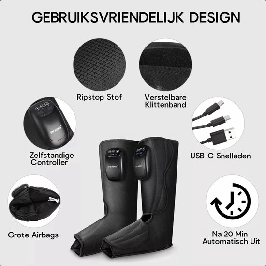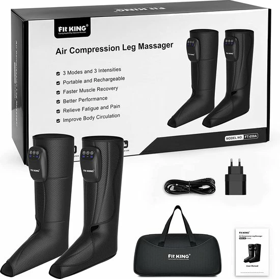 Het FIT KING Been- en voetmassage apparaat werkt middels de beloofde bloed- en lymfecirculatie therapie. Het apparaat pompt lucht in de airbags van de voeten naar de benen in een continue cyclus. Het ergonomische apparaat maakt gebruik van 2 massage modes en 3 niveaus van drukintensiteit. De massagetechnieken stimuleren de bloedsomloop in de benen en zijn gunstig voor de genezing van pijn, spanning in de benen, beenkrampen, losmaken van stijve spieren, en algemene spanning in de ledematen. Het apparaat beschikt daarnaast ook over een automatische uitschakelfunctie nadat het 20 minuten in gebruik is geweest. Dit is erg handig, voor jong en oud!