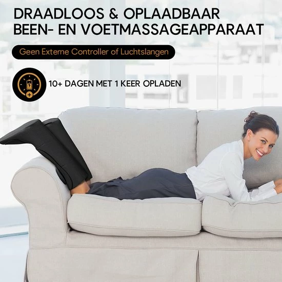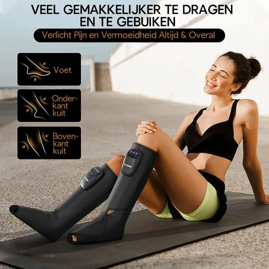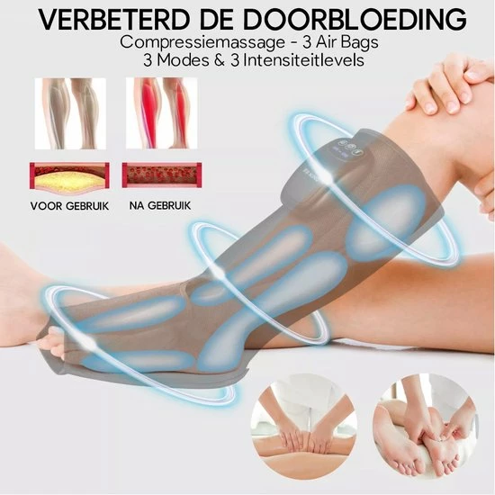 Het sequenti?le compressie massage apparaat bedekt met zijn 3 + 3 airbags jouw volledige voeten, enkels en kuiten. Dit geeft een full surrounding 3D ervaring. Er zijn 3 massagestanden en intensiteitsniveaus beschikbaar.