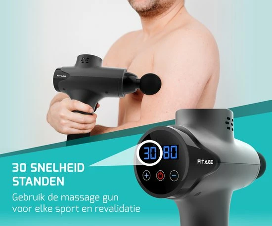Het FITAGE massage pistool heeft maar liefst 15 opzetstukken. Dit zijn er meer dan je bij veel vergelijkbare massage apparaten krijgt. Elk van de opzetstukken is ontwikkeld om een bepaald probleem te verhelpen of een bepaald lichaamsdeel te masseren. De grote bal is bijvoorbeeld zeer geschikt voor grote spiergroepen als de benen, terwijl je met de platte kop de hamstrings en borst kunt masseren. Verder heb je onder meer een fork-head opzetstuk voor de wervels, en een bullet opzetstuk voor knopen en pijnlijke spieren. De precieze functies van alle opzetstukken lees je in de productafbeelding en onze mail.. De opzetstukken zijn eenvoudig te verwisselen, zodat je in ??n massage meerdere gebieden specifiek kunt masseren. Daarnaast heeft de massage gun maar liefst 30 standen, zodat je precies de intensiteit kunt kiezen die je nodig hebt en prettig vindt.