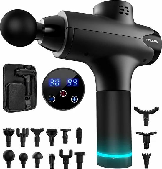 De FITAGE Massage Gun is een krachtig massage apparaat voor thuis waarmee je stijve spieren snel weer los maakt. Spierpijn en kramp kunnen erg vervelend zijn tijdens het trainen, vooral als je een specifiek doel voor ogen hebt. Met dit therapeutische handmassage apparaat kun je de intensiteit met 30 verschillende niveaus naar behoefte aanpassen en wisselen tussen 15 verschillende opzetstukken. Hiermee pak je diepe knopen in je spierweefsel gericht aan, zelfs op lastige plekken. Zo geef je het spierherstel een boost, verbeter je de doorbloeding en ben je, naast meer ontspannen, sneller klaar om weer op volle kracht te sporten. Of je nu een beginnende of fanatieke atleet bent, de FITAGE Massage Gun is onmisbaar bij het behalen van al jouw fitnessdoelen!