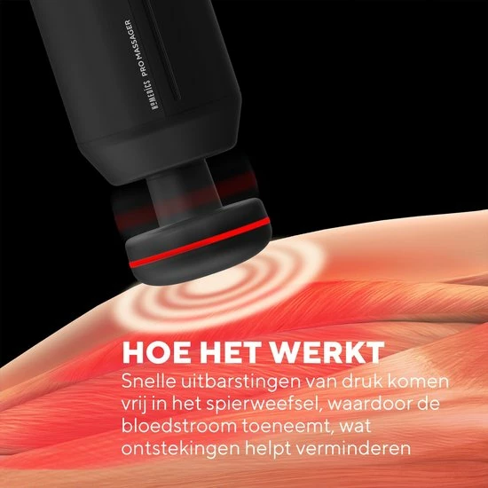 De HoMedics PGM-1000 Massage Gun maakt gebruik van compressie- en klopmassage. De vibrerende werking hiervan stimuleert het zenuwstelsel en bevordert ontspanning door middel van snelle uitbarstingen van druk. Hierdoor neemt de bloedstroom toe in het spierweefsel en verminderen de ontstekingen.