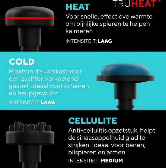 De ?Heat? opzetkop maakt gebruik van warmte. Het opzetstuk warmt op tot 47 graden Celsius in minder dan 2 minuten. Door de Tru Heat technologie zorgt het opzetstuk voor een effectieve opwarming waardoor spieren nog sneller ontspannen.