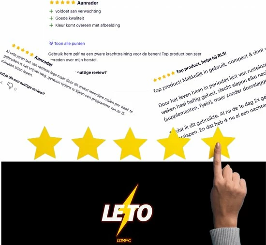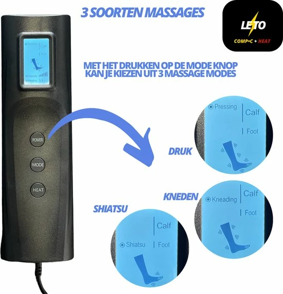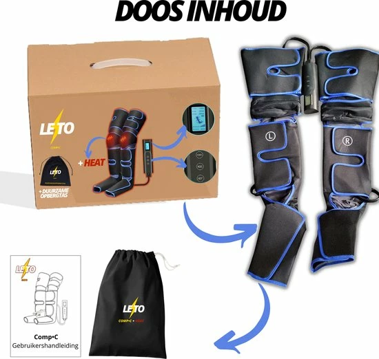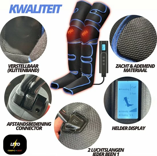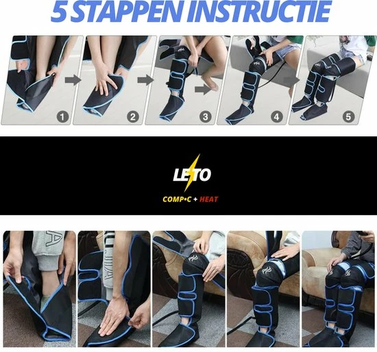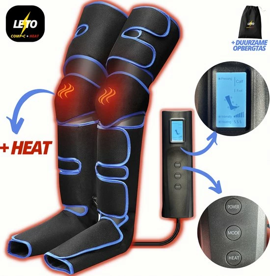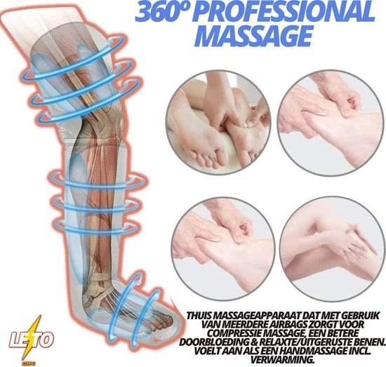 Dit LETO? voetmassage en beenmassage apparaat biedt jou gepersonaliseerde compressie massagetherapie wat kan bijdragen bij veel vervelende klachten zoals rusteloze benen, verminderde lymfestroming/doorbloeding of pijnlijke spieren. Het voet- en beenmassage apparaat omhelst de voeten, kuiten en dijen stevig, waardoor de strak gespannen pijnlijke spieren volledig tot ontspanning worden gebracht.