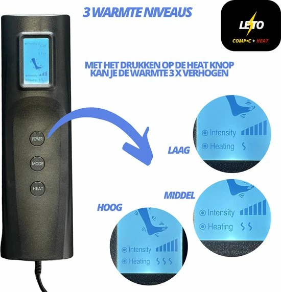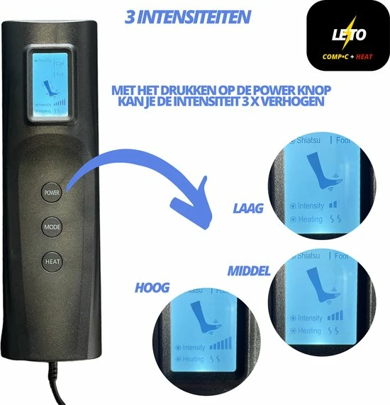 Dit beenmassage en voetmassage apparaat is voorzien van keuzemogelijkheid uit drie intensiteit-levels (laag-midden-hoog). Pas elke massagesessie aan na jouw behoeften op dat specifieke moment. Plaats je benen in het apparaat, bevestig met de klittenband, voer de gewenste massage behandeling in op de digitale afstandsbediening, leun achterover en geef jouw voeten, kuiten en bovenbenen de ontspanning die ze verdienen.