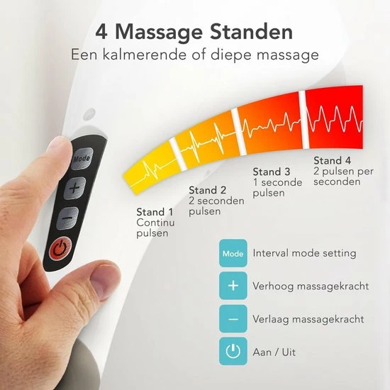Kies uit vier pulseerstanden: continu pulsen, pulsen van twee seconden, pulsen van ??n seconde, of twee pulsen per seconde. Vervolgens verhoog of verlaag je de massagekracht op het bedieningspaneel naar behoren. Geniet zo van de ideale massage!