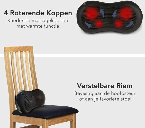 Het kussen is uitgerust met vier knedende massagekoppen. De massagekoppen draaien zowel met de klok mee als tegen de klok in. Je voelt dat je lichaam diep gemasseerd wordt en spanning langzaam wegtrekt.