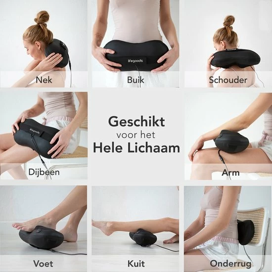 Het kussen is uiteraard ideaal voor het masseren van de nek en schouders. Echter kun je het kussen voor het gehele lichaam gebruiken. Denk aan buikspieren, de boven- of onderrug, kuiten of zelfs de voeten.