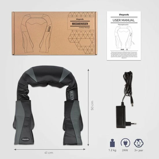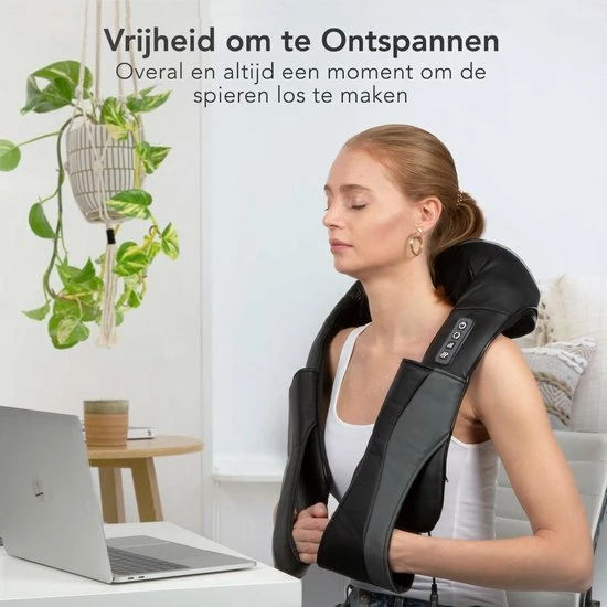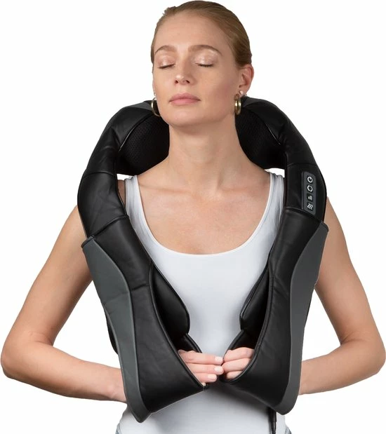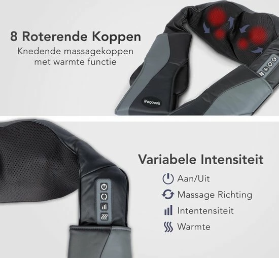 Ervaar de ontspanning van dit rug-, schouder- of nekmassagekussen met 8 roterende Shiatsu massagekoppen. Kies uit drie verschillende intensiteitsstanden en zet de warmtefunctie aan of uit. Dankzij de handige armlussen hoef je het LifeGoods nek- en schoudermassagekussen nergens aan te bevestigen. Het warmte-element wordt 40?C en is daarmee ideaal om alle spieren los te masseren. Het kussen is geschikt voor het hele lichaam en gaat automatisch uit na een 15 minuten durende welverdiende massage!