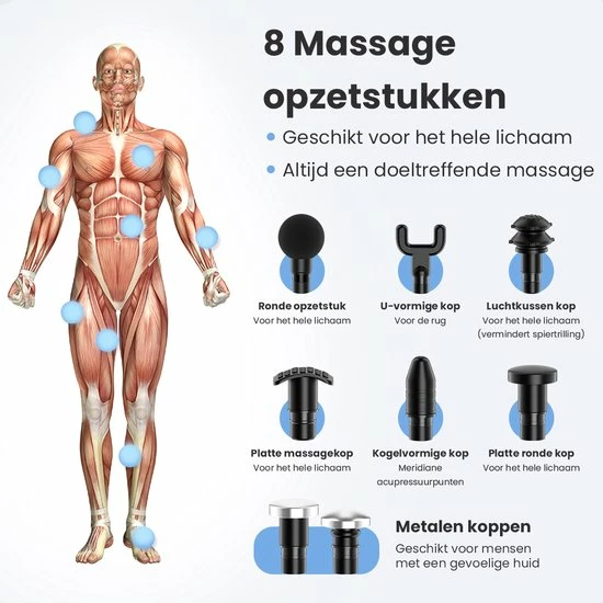 - Kogelvormige kop: Speciaal ontworpen om gewrichten, trigger points en spierknopen te behandelen