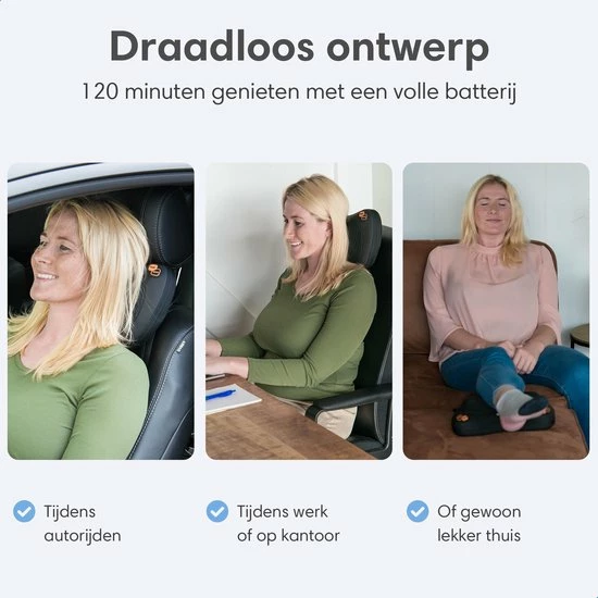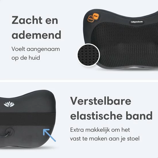 Heeft u last van stress of spierpijn in uw nek? Dit luxe, draadloze Shiatsu massagekussen van Lifeproducts is alles wat u nodig heeft! Geniet elke dag van een verlichtende massage. Het massageapparaat is te gebruiken voor het masseren van uw nek, schouders, (onder) rug en benen. Het massagekussen van Lifeproducts heeft 4 bedienings knoppen en is tevens in de auto te gebruiken. Met de elastische band aan de achterkant bevestigt u het kussen gemakkelijk aan elke hoofdsteun. Met de ingebouwde accu gebruikt u het massagekussen nu ten minste 2 uur draadloos!