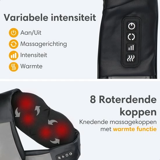 Het massagekussen van Lifeproducts heeft in totaal 8 massagekoppen. De roterende beweging zorgt voor een heerlijke massage. De massagekoppen zijn voorzien van speciale infrarood technologie. Dit heeft een verwarmend en ontspannend effect op de massageplek. De spieren worden warm en zullen sneller ontspannen. Zo kunt u nog meer genieten van de heerlijke kneedmassage.