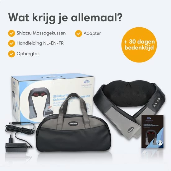 Heeft u last van stress of spierpijn in uw nek? Dit Shiatsu massagekussen van Lifeproducts is alles wat u nodig heeft! Geniet elke dag van een verlichtende massage. Het draadloze massageapparaat is te gebruiken voor het masseren van uw nek, schouders, (onder) rug en benen. Het massagekussen van Lifeproducts heeft 4 bedienings knoppen en kan onder andere in de auto te gebruikt worden. Het massagekussen beschikt over een accu en is ongeveer 2 uur draadloos te gebruiken. Zo geniet u waar u maar wilt van een heerlijke shiatsu massage!