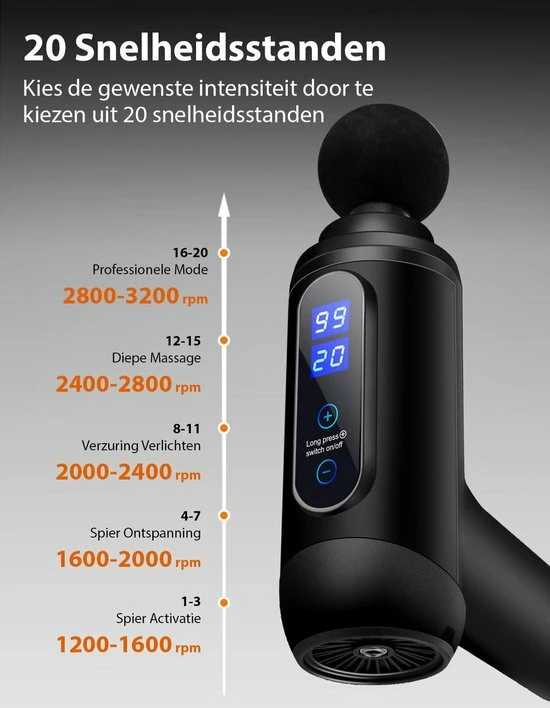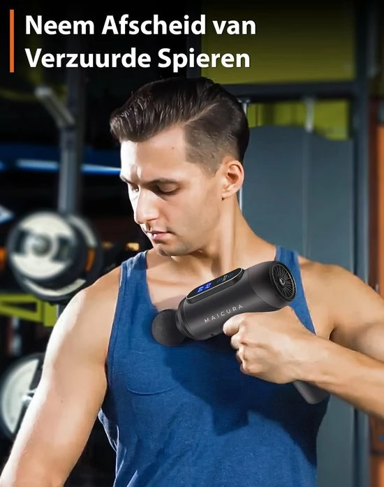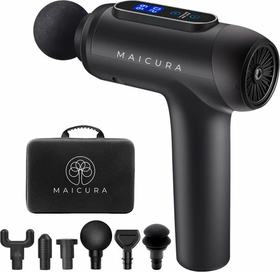 De Maicura Massage Gun heeft veel te bieden. In de Massage Gun zit een krachtige batterij die tot wel 8 uur mee gaat. De batterij levert energie aan een stille, maar vooral krachtige motor. Hoe krachtig? Dat is aan jou. De Massage Gun geeft je de mogelijkheid om uit 20 snelheidsstanden te kiezen. Hierdoor kun je precies de juiste intensiteit van je behandeling bepalen. Dit allemaal kun je eenvoudig instellen op het LCD-Touch Screen. De Massage Gun wordt geleverd in een mooie verpakking met daarin 6 opzetstukken en een luxe meeneem-case.