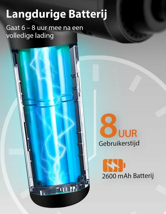 De Maicura massage gun is speciaal ontwikkeld voor lang gebruik. De massage gun bevat een 2600 mAh batterij die tot wel 8 uur mee gaat en is daarna binnen 3 uur weer opgeladen. De stand van de batterij wordt overzichtelijk in 5 fases weergegeven op het LCD?Scherm. Waarbij 99 aangeeft dat hij vol is en 20 aangeeft dat hij nog maar 20% heeft.