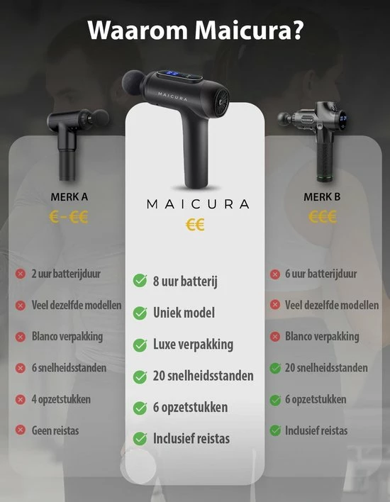 Wil jij blessures voorkomen, spierherstel bevorderen, stijfheid verminderen of simpelweg genieten van een heerlijke massage? Dan is de Maicura Massage Gun geschikt voor jou. Deze massage gun is krachtig, stil en van hoogwaardige kwaliteit. Met zijn unieke design en vele mogelijkheden is de massage gun een aanwinst voor iedereen: Atleten, fysiotherapeuten en mensen die even heerlijk tot rust willen komen. Kort samengevat, de Maicura Massage Gun is een herstel- ?n ontspanningsapparaat in ??n!