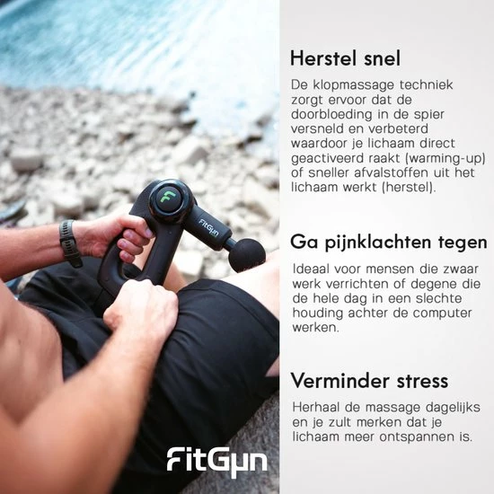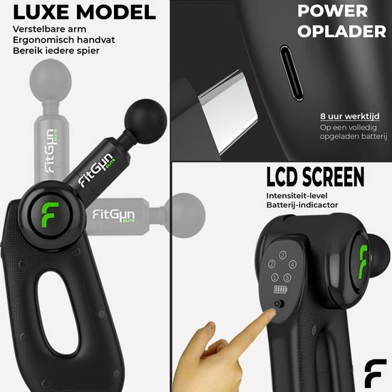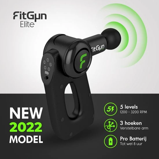 Nieuw model 2022. Ben jij op zoek naar een massage apparaat dat jou helpt bij het herstel van spierpijn, de bloedsomloop verbeter en zelfs je prestaties verbeterd? De FitGun Elite zal jou hierbij helpen! Deze massage gun wordt niet alleen gebruikt door topsporters, maar ook door masseurs en fysiotherapeuten. Met een unique verstelbare arm kan jij iedere spier zonder moeite masseren en verklein jij de kans op vervelende blessures of chronische pijn.
