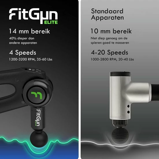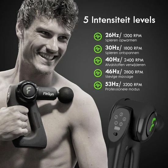 De Massage Gun werkt middels vibratiemassage. De FitGun Elite beschikt over vijf verschillende intensiteiten oplopend tot wel 3500 rpm. Het is recent bewezen dat deze massage methode positieve invloed heeft op chronische pijn, stijve spieren, gespannen spieren en spierpijn. Daarnaast is het een van de meest effectieve massage methodes.