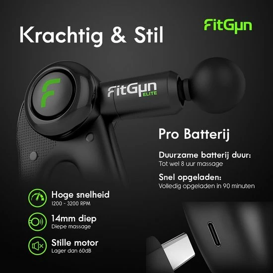 De Massage Gun beschikt over een enorm stille motor. Het geluid is slechts 35-55 decibel. Een kenmerk van de FitGun Elite is de duurzame batterij, een volle batterij gaat namelijk tot wel 8 uur mee!