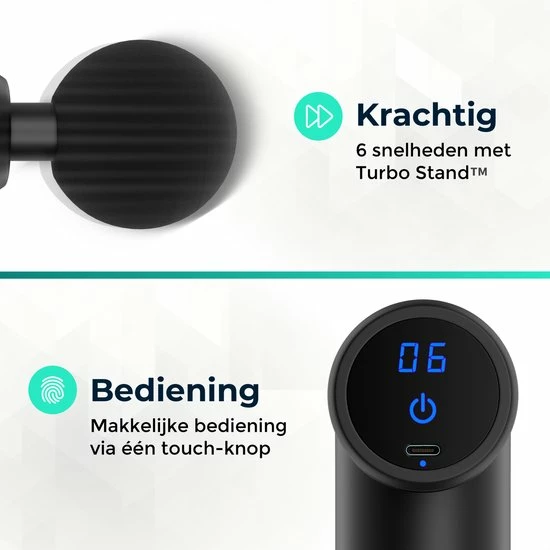 Ons massage pistool heeft een batterijduur van maar liefst 2 uur zodat je uitgebreid van jouw massage kunt genieten. Sluit het apparaat aan via de bijgeleverde oplaadkabel en het apparaat is zo weer opgeladen. Je krijgt er ook nog een adapter bij voor het gemak. Op het LCD-scherm zie je in welke stand het apparaat staat.