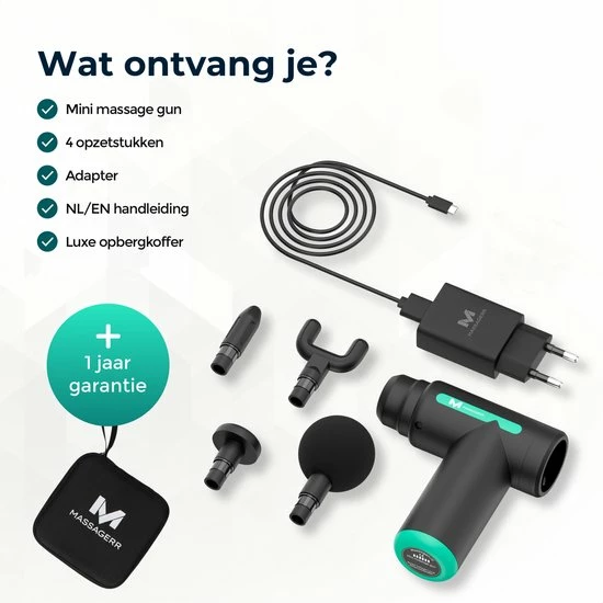 Onze Massagerr® wordt geleverd in een luxe opbergkoffer waarin je het apparaat én alle accessoires netjes kunt opbergen. Zo raak je geen onderdelen kwijt en neem je het massage pistool makkelijk mee op reis.