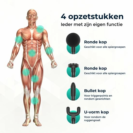- Balvormig opzetstuk: geschikt voor iedere spiergroep. Werkt optimaal bij grote spiergroepen zoals de benen, billen, voeten, schouders en armen.