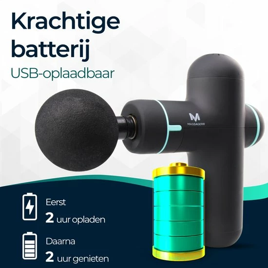 De Massagerr? mini massage gun gaat tot wel 2 uur mee. Hij kan worden opgeladen middels een USB-C kabel die je erbij krijgt. Je krijgt er ook nog een adapter bij voor het gemak. Het apparaat is binnen ongeveer 2 uur volledig opgeladen. Je kunt aan de onderkant zien wanneer hij volledig is opgeladen.