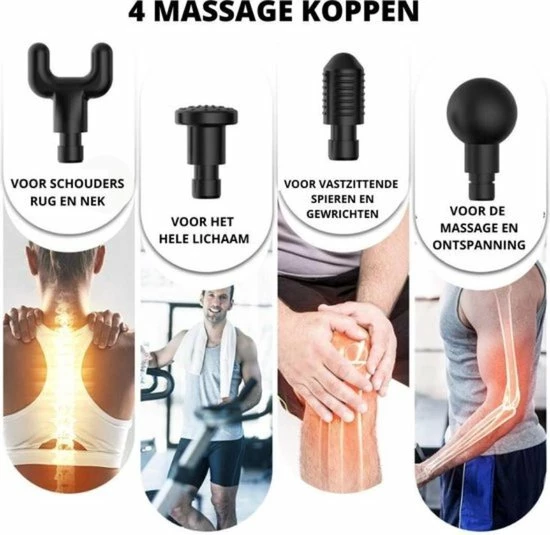 De Massage Gun is over het hele lichaam te gebruiken. Je kan kiezen van level 1 t/m 6 qua sterkte. De 4 kopstukken die er bij meegeleverd worden maakt het nog makkelijker om bepaalde lichaamsdelen echt goed aan te spreken: