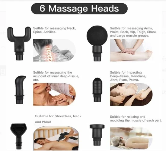 Elke spiergroep is anders en elk doeleinde vereist een andere aanpak, daarom krijg je bij de Yousupply massagegun 6 opzetstukken voor verschillende spiergroepen: