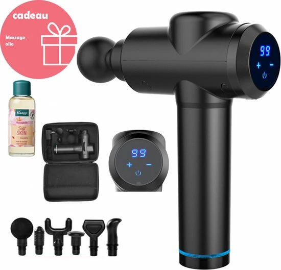 Inhoud van de verpakking: Massage Gun, 6x Opzetstukken, Oplader, Opbergkoffer, Massageolie 20ml, Handleiding
