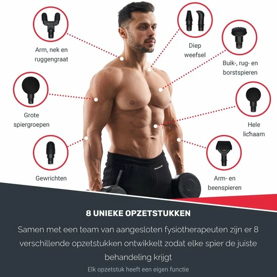 Samen met een fysiotherapeut zijn er 8 opzetstukken ontwikkelt zodat elke spier de juiste aandacht krijgt. Elke spiergroep is te behandelen met een eigen opzetstuk wat de vibratie intensiteit bepaald. De ene spier heeft een krachtige massage nodig terwijl de andere juist een zachte massage nodig heeft. In de handleiding is exact terug te lezen welk opzetstuk jij het beste kunt gebruiken voor welke spier. In deze handleiding staat ook exact aangegeven op welke vibratiestand de bepaalde spieren het beste behandeld kunnen worden voor het maximale resultaat.