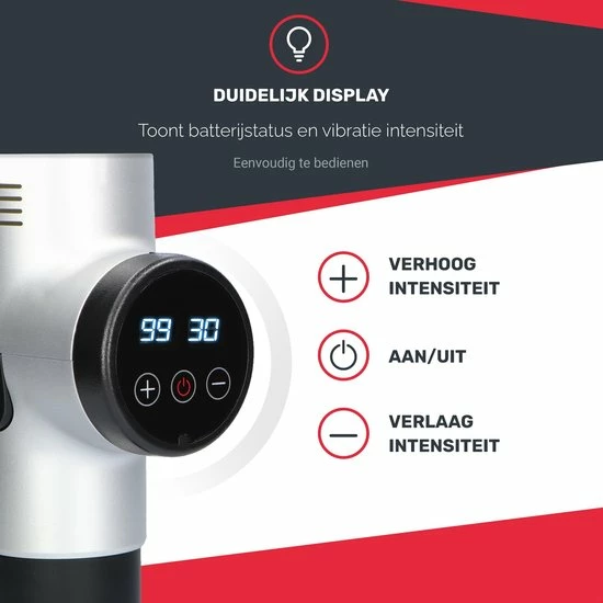 Spierpijn en spierstijfheid zijn heel normaal na een zware training maar kunnen zeer vervelend zijn. Met de massage gun masseer je alle vaste knopen los. De spieren worden tot ontspannen toe los gemasseerd. Het resultaat is dat de spierpijn aanzienlijk verlicht wordt en jij je weer kan focussen op je volgende training.