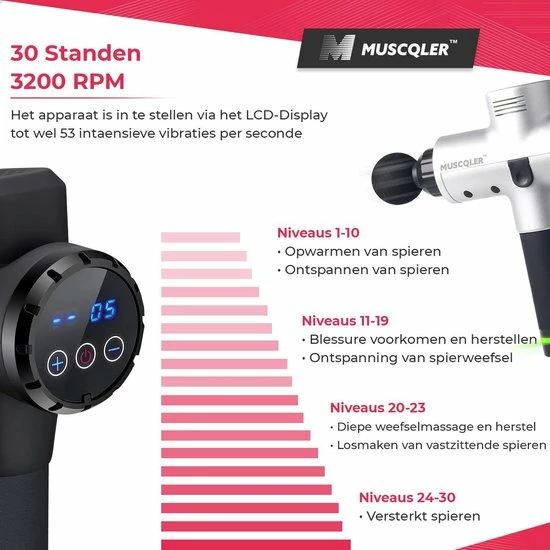 Deze massage gun is met 30 verschillende vibratie standen het meest geavanceerde massage apparaat op de markt. Het apparaat is in te stellen via het LCD-Display tot wel 53 intensieve vibraties per seconde. Daarnaast is er in de massage gun een stilte technologie toegepast waardoor het masseren vrijwel geluidloos is.