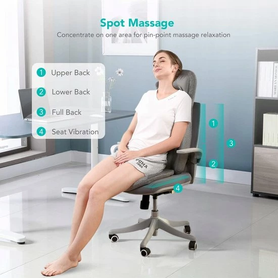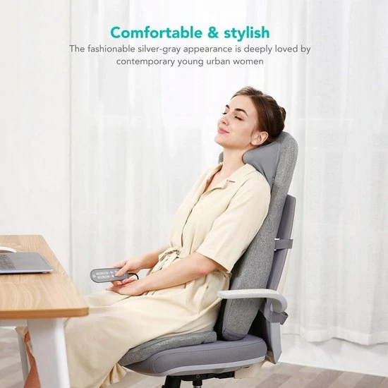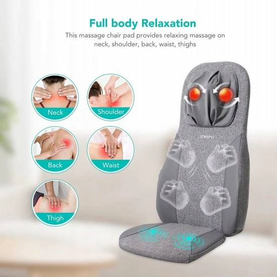 NEK- EN VOLLEDIGE LICHAAMSMASSAGE: Massagezitkussen in moderne stijl met nek en rugknopen, diepe kneedmassage voor de rug, nek en schouders; de overige 4 massageknopen kunnen worden aangepast, gecombineerd met acupressuur, rollende massage bovenrug, middenrug en taille; de trillingen van de heupen nemen de vermoeidheid van de dag weg.