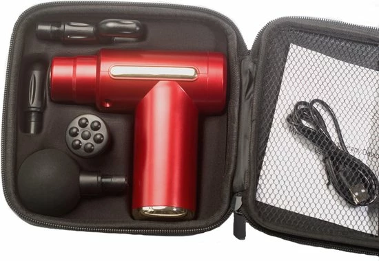 De Massage Gun wordt geleverd in een stevige case, waardoor je hem overal mee naartoe kunt nemen. De case is compact en makkelijk om mee te nemen.