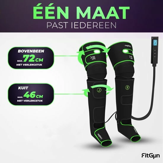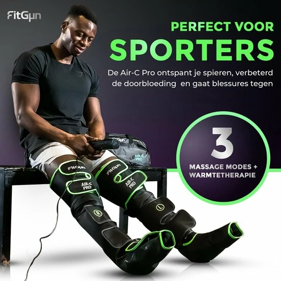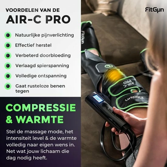 Als je lang staat of zit, niet in staat bent om te bewegen of een fanatieke sporter bent, kun je last hebben van vermoeide benen met een verminderde doorbloeding. De FitGun Air-C Pro biedt gepersonaliseerde compressie massagetherapie wat kan bijdragen bij veel vervelende klachten zoals rusteloze benen, verminderde doorbloeding/lymfestroming of pijnlijke spieren. Het Professioneel uitgerust beenmassage-apparaat omhelst de voeten, kuiten en dijen stevig, waardoor de strakgespannen pijnlijke spieren volledig tot ontspanning worden gebracht.