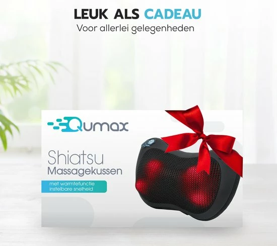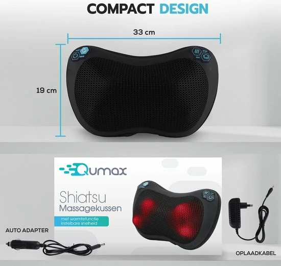 Het Qumax shiatsu massagekussen is een fijne tool wanneer jij toe bent aan wat ontspanning. Het massage apparaat beschikt over infrarood warmte, speciaal voor iedereen die behoefte heeft aan een massage van de nek, rug en benen. Je kunt het massagekussen met 4 massagekoppen naar eigen wens aanpassen door middel van de instelbare rotatierichting en snelheid van de rotaties. Dankzij het compacte design kun je op elk moment van de dag genieten van een massage. Het massagekussen wordt inclusief auto adapter geleverd.